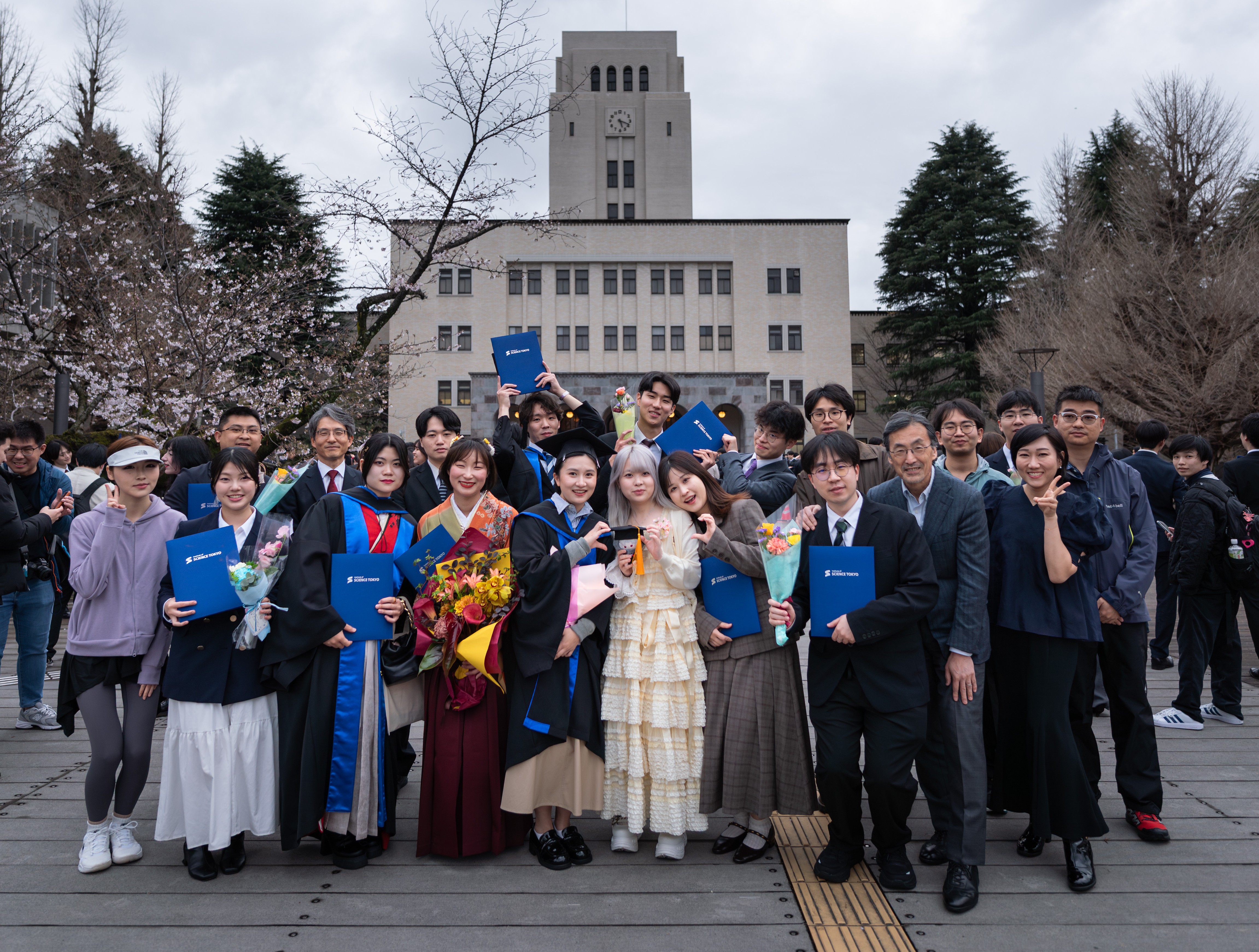 3月19日(木)送別会 ,3月26日(木)学位伝達式が開催されました. [本館前で] おめでとうございます!